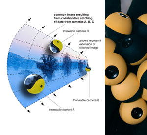 In an example future application of Scattershot360 technology, hundreds of pellet-sized cameras are disbursed over a forest fire during a search-and-rescue operation. Penetrating the forest canopy, the cameras transmit images along with respective location and orientation data, collaborating together in real time to produce a unified image map of the entire forest from treetops to floor. Such an application would be impractical for UAVs and other solutions reliant on self-propulsion for access.